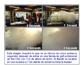 Los ladrones saben que las autoridades tardan un tiempo en responder a la activación de una alarma. Y en esos minutos ellos han podido robar sus pertenencias, y escapar sin dejar rastro.BANDIT Le proporciona la mejor y la más rápida solución para evitar este problema“Lo que no puedes ver, no lo puedes robar”El BANDIT es el sistema más rápido de seguridad SIN RESIDUOS de su clase en el mundo. Cuando los sensores detectan un intruso, el sistema de alta presión patentado por BANDIT lanza al instante una densa y visualmente impenetrable niebla de un ratio de 28 metros cúbicos por segundo que sólo en los 2 primeros segundos se proyecta hasta 6m. Una tienda, una oficina o un salón de muestras de un promedio de 140 metros cúbicos puede quedar cubierto tan sólo en 5 segundos. El sistema más rápido de acción, el equipo y los demás contenidos pueden ser escondidos para evitar que se les dañe o robe hasta que llegela policía. |